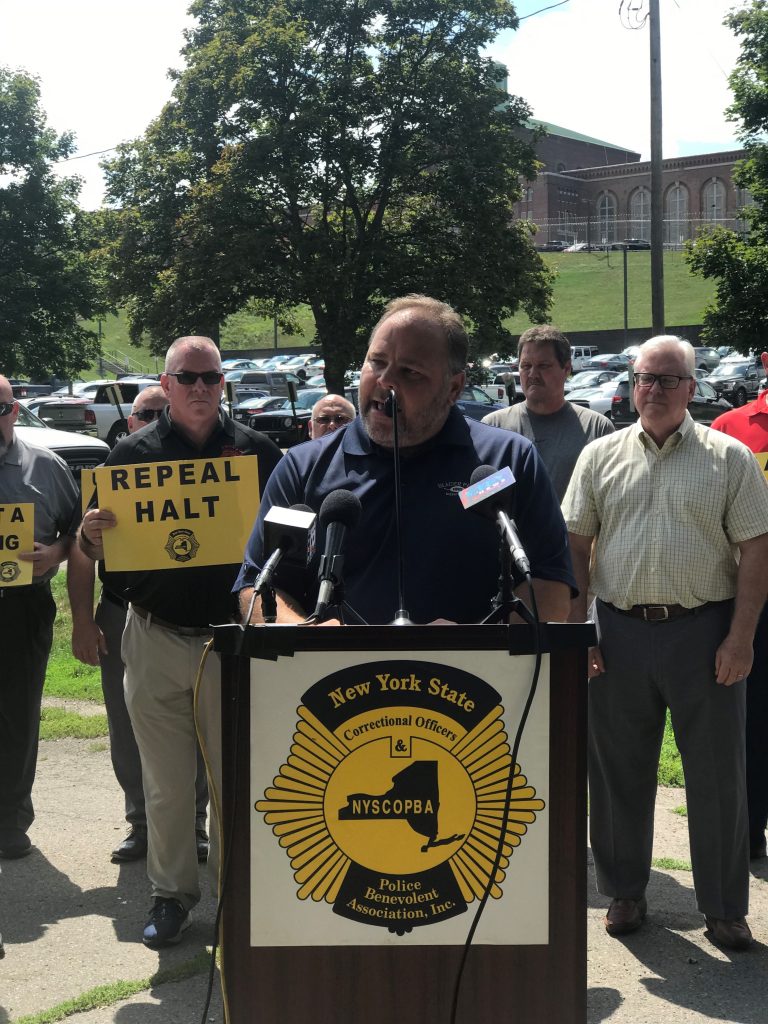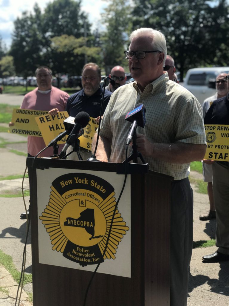 Elmira, N.Y., August 17—State Senator Tom O’Mara (R,C-Big Flats), Assemblyman Chris Friend (R,C-Big Flats), and Assemblyman Phil Palmesano (R,C-Corning) today joined New York State Correctional Officers & Police Benevolent Association (NYSCOPBA) President Michael Powers and Western Region Vice President Kenny Gold outside the Elmira Correctional Facility (ECF) to call on Governor Kathy Hochul and state legislative leaders to repeal the “Humane Alternatives to Solitary Confinement (HALT) Act.” Full Press Release