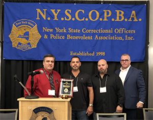 Officer Anthony Durante – On July 7th, 2019 at approx.. 9:40AM while at a property he owns in Illion NY, he observed from the porch that Illion PD officers were attempting to arrest an unknown male subject on a neighboring residence porch and a struggle ensued, he responded to their location and assisted the officers in subduing the individual. (Award presented at the September 2019 NYSCOPBA EA in Syracuse)